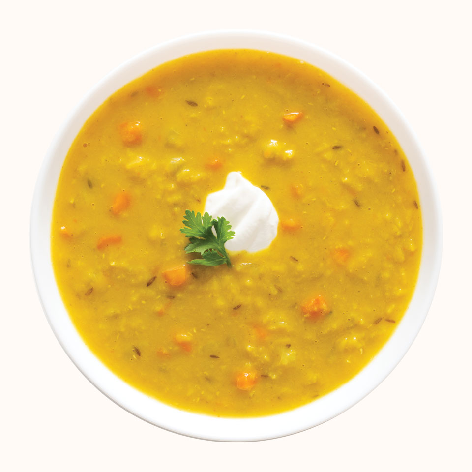 Red Lentil Dahl soup has 200 calories/ cup and 12 grams protein ( a vegetarian's dream numbers) and 8 grams of fiber.